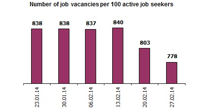 Association of Regional Recruitment Agencies “ARKA” and Navigator Consulting Company together with the largest job websites inform about change in Labour market index of Ukraine as of February 27, 2014. Labour market index shows change of demand and supply, Ukrainian labour market trends over the past 6 weeks. Index growth indicates increase in demand for personnel in Ukraine. Index fall indicates that it is getting more difficult for an average job seeker to get a job. The index of labour market over the week sharply decreased to 5 points. The activity of employers in the market decreased.