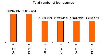 Association of Regional Recruitment Agencies “ARKA” and Navigator Consulting Company together with the largest job websites inform about change in Labour market index of Ukraine as of March 13, 2014. Labour market index shows change of demand and supply, Ukrainian labour market trends over the past 6 weeks. Index growth indicates increase in demand for personnel in Ukraine. Index fall indicates that it is getting more difficult for an average job seeker to get a job. The index of labour market for the week increased by 8 points. The activity of employers in the market increased.