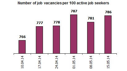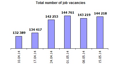 Association of Regional Recruitment Agencies “ARKA” and Navigator Consulting Company together with the largest job websites inform about change in Labour market index of Ukraine as of May 15, 2014. Labour market index shows change of demand and supply, Ukrainian labour market trends over the past 6 weeks. Index growth indicates increase in demand for personnel in Ukraine. Index fall indicates that it is getting more difficult for an average job seeker to get a job. The index of labour market increased within the week by 8 points. The activity of employers in the market has increased.