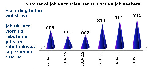 Association of Regional Recruitment Agencies “ARKA” and Navigator Consulting Company together with the largest job websites inform about change in Labour market index of Ukraine as of May 08, 2012. Labour market index shows change of demand and supply, Ukrainian labour market trends over the past 5 weeks. Index growth indicates increase in demand for personnel in Ukraine. Index fall indicates that it is getting more difficult for an average job seeker to get a job.