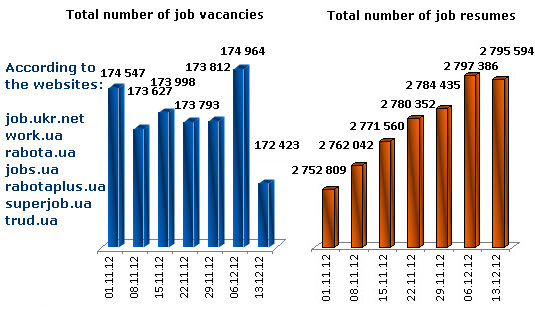 Association of Regional Recruitment Agencies “ARKA” and Navigator Consulting Company together with the largest job websites inform about change in Labour market index of Ukraine as of December 13, 2012. Labour market index shows change of demand and supply, Ukrainian labour market trends over the past 5 weeks. Index growth indicates increase in demand for personnel in Ukraine. Index fall indicates that it is getting more difficult for an average job seeker to get a job. The index of the labor market for the week decreased - by 10 points. Active employers (appearance of new jobs) generally lags behind the activity of job seekers