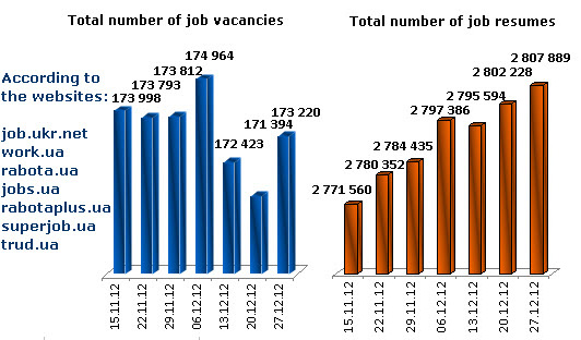 Association of Regional Recruitment Agencies “ARKA” and Navigator Consulting Company together with the largest job websites inform about change in Labour market index of Ukraine as of December 27, 2012. Labour market index shows change of demand and supply, Ukrainian labour market trends over the past 5 weeks. Index growth indicates increase in demand for personnel in Ukraine. Index fall indicates that it is getting more difficult for an average job seeker to get a job. Selection of candidates for vacancies has increased by 6 points over Labour Market Index for the week increased by 39 points. Active employers increased, oddly enough, on the eve of the New Year.