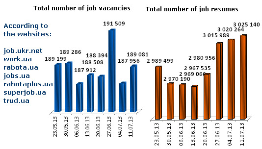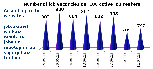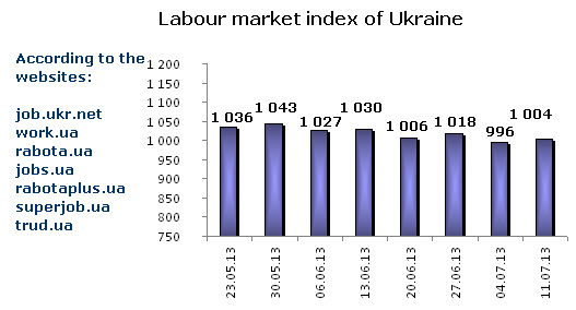 Association of Regional Recruitment Agencies “ARKA” and Navigator Consulting Company together with the largest job websites inform about change in Labour market index of Ukraine as of July 11, 2013. Labour market index shows change of demand and supply, Ukrainian labour market trends over the past 6 weeks. Index growth indicates increase in demand for personnel in Ukraine. Index fall indicates that it is getting more difficult for an average job seeker to get a job. Index of labour market for the week increased by 8 points. The activity of employers in the labour market increased.