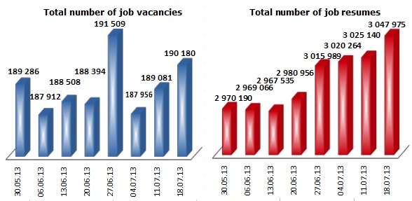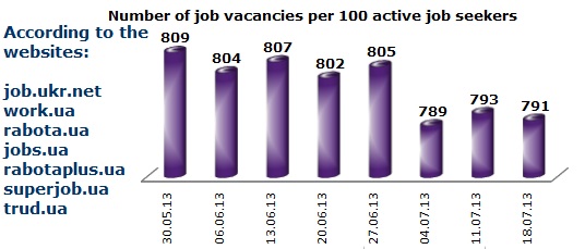 Association of Regional Recruitment Agencies “ARKA” and Navigator Consulting Company together with the largest job websites inform about change in Labour market index of Ukraine as of July 18, 2013. Labour market index shows change of demand and supply, Ukrainian labour market trends over the past 6 weeks. Index growth indicates increase in demand for personnel in Ukraine. Index fall indicates that it is getting more difficult for an average job seeker to get a job. Index of labour market for the week increased by 2 points. The activity of employers in the labor market practically has not changed.