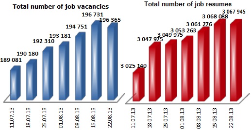 Association of Regional Recruitment Agencies “ARKA” and Navigator Consulting Company together with the largest job websites inform about change in Labour market index of Ukraine as of August 22, 2013. Labour market index shows change of demand and supply, Ukrainian labour market trends over the past 6 weeks. Index growth indicates increase in demand for personnel in Ukraine. Index fall indicates that it is getting more difficult for an average job seeker to get a job. Index of labour market decreased within the week by 4 points. The activity of the employers on the market has fallen slightly.