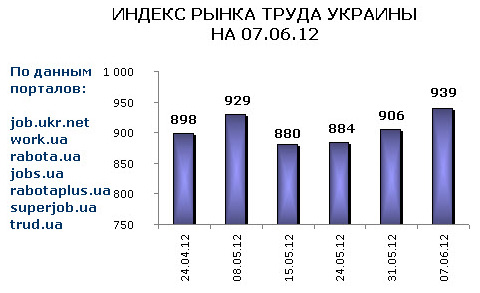 Ассоциация региональных кадровых агентств «АРКА» и Консалтинговая компания «Навигатор», совместно с крупнейшими интернет порталами по трудоустройству, сообщают об изменении Индекса рынка труда Украины по состоянию на 07.06.2012г.