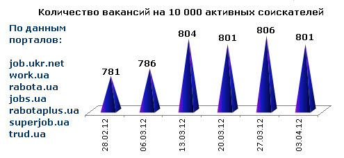 По сравнению прошлой неделей, выбор вакансий на 1 соискателя в среднем чуть-чуть уменьшился. Однако все равно показатели марта 2012 г. – самые высокие за последние 5 месяцев!